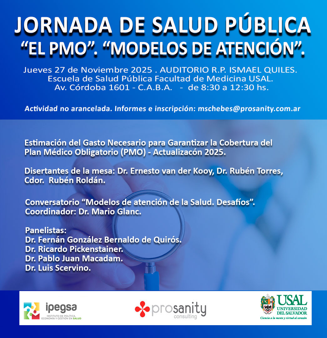 JORNADA DE SALUD PÚBLICA. “EL PMO”. “MODELOS DE ATENCIÓN”. 27 de Noviembre 2025 AUDITORIO R.P. ISMAEL QUILES - FACULTAD DE MEDICINA – USAL 08.00hs: Acreditación e Inscripciones. 08.30hs: Apertura de la Jornada a cargo de la Directora de la Escuela de Posgrado de la USAL, María del Carmen Bacqué. 8.40hs: Presentación: “Estimación...